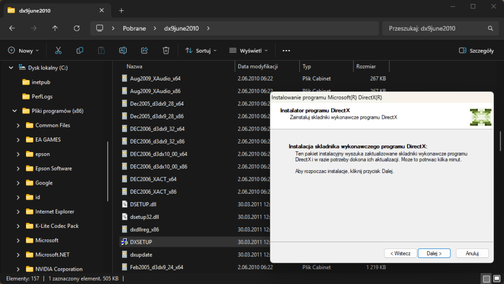 Jeśli plik na stronie Microsoftu nie jest już dostępny pobierz go bezpośrednio z mojej strony. Stworzyłem backup na początku stycznia 2026 i testowałem plik na Windows 11: directx_Jun2010_redist.exe