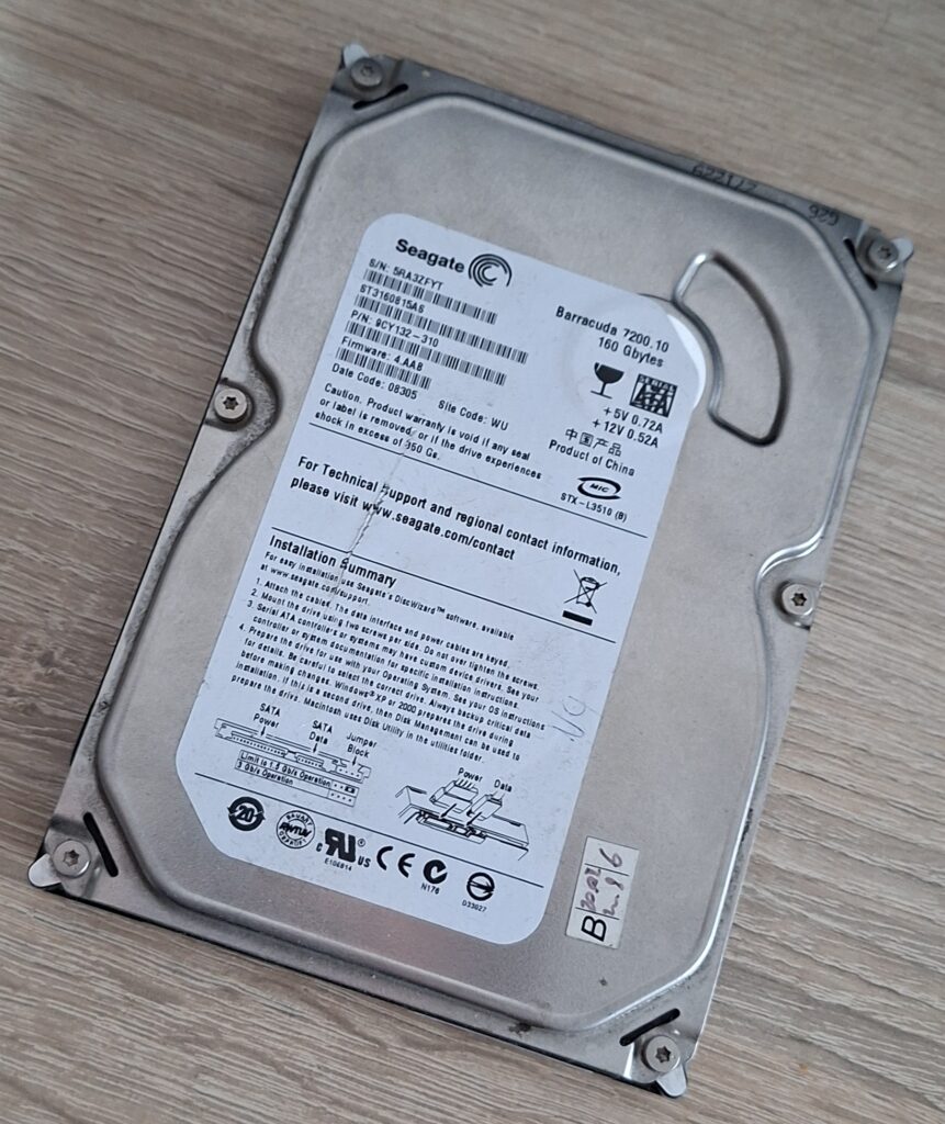 Do zestawu wpada dysk, który mam u siebie dobre 15 lat. Jest to Seagate Barracuda o pojemności 160 GB i prędkości wirowania talerzy 7200. Dysk ma interfejs SATA II i jest stosunkowo świeży, za co mam nadzieję nie zostanę zrugany przez czytelników. Myślałem o dysku IDE/ATA, ale nie chciałem aż tak spowalniać sobie pracy z PeCetem. Myślę, że ten dysk to idealny kompromis, tym bardziej, że jest z 2007 roku, a sama płyta ma złącze SATA I, przez co dysk nie będzie aż tak się rozpędzał z transferem.