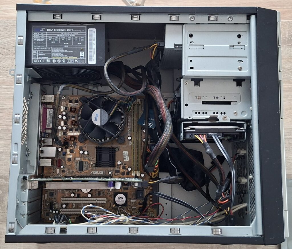 W pierwszym wpisie na ten temat pisałem o pewnej obudowie i faktycznie udało mi się odkopać ją w budynku za szafą. To stara obudowa Vobis Tower. Niestety nigdzie nie ma oficjalnej nazwy, wiem tylko, że pochodzi z zestawu nazywanego „Vobis Digital VD”, a wewnątrz jest miejsce na płytę microATX, dwa napędy 5,25”, dwa napędy dyskietek 3,5” i jeden dysk twardy 3,5”. Lubię tę obudowę, bo po zamknięciu wszystkich klapek front jest jednolity w srebrnym kolorze, przez co wygląda bardzo dobrze nawet jak na dzisiejsze standardy. Dodatkowo obudowa ma na froncie naklejki z oznaczeniami Pentium 4, nVidia i Windows XP, więc to najlepszy możliwy zestaw dla moich potrzeb.