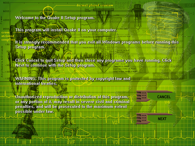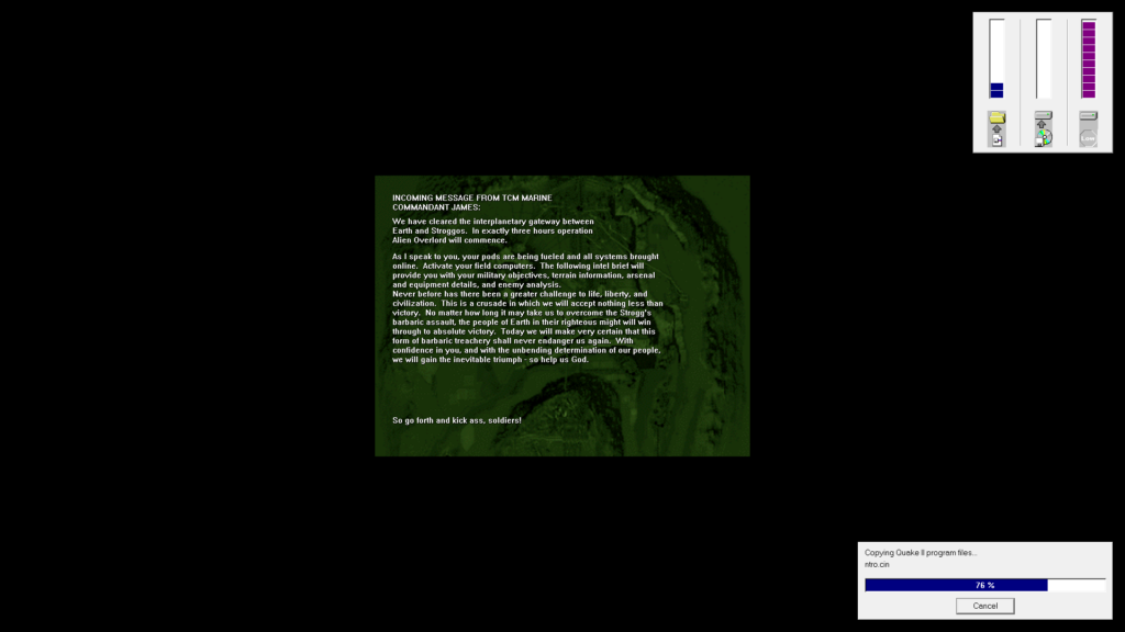 Instalacja gry różni się bardzo mocno w zależności od posiadanej wersji. W naszym cudownym kraju mało kto ma prawdziwego Big-Boxa z pełną zawartością gry. Ba, mało osób wie, że Quake 2 ma tak świetny soundtrack! Ale o tym w kolejnym rozdziale. Najpopularniejsze było chyba wydanie „gazetkowe” np. CD-Action. Sama instalacja różni się w zależności od wydania i może odbyć się dokładnie tak, jak na starszych systemach – odpalamy instalator, wskazujemy ścieżkę i po kilku chwilach gra jest zainstalowana.