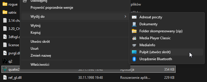 Po zainstalowaniu patcha zostaje już tylko stworzenie skrótu do gry. W tym celu klikamy Prawym Przyciskiem Myszy na pliku quake2.exe i po rozwinięciu Więcej opcji wysyłamy skrót na pulpit.